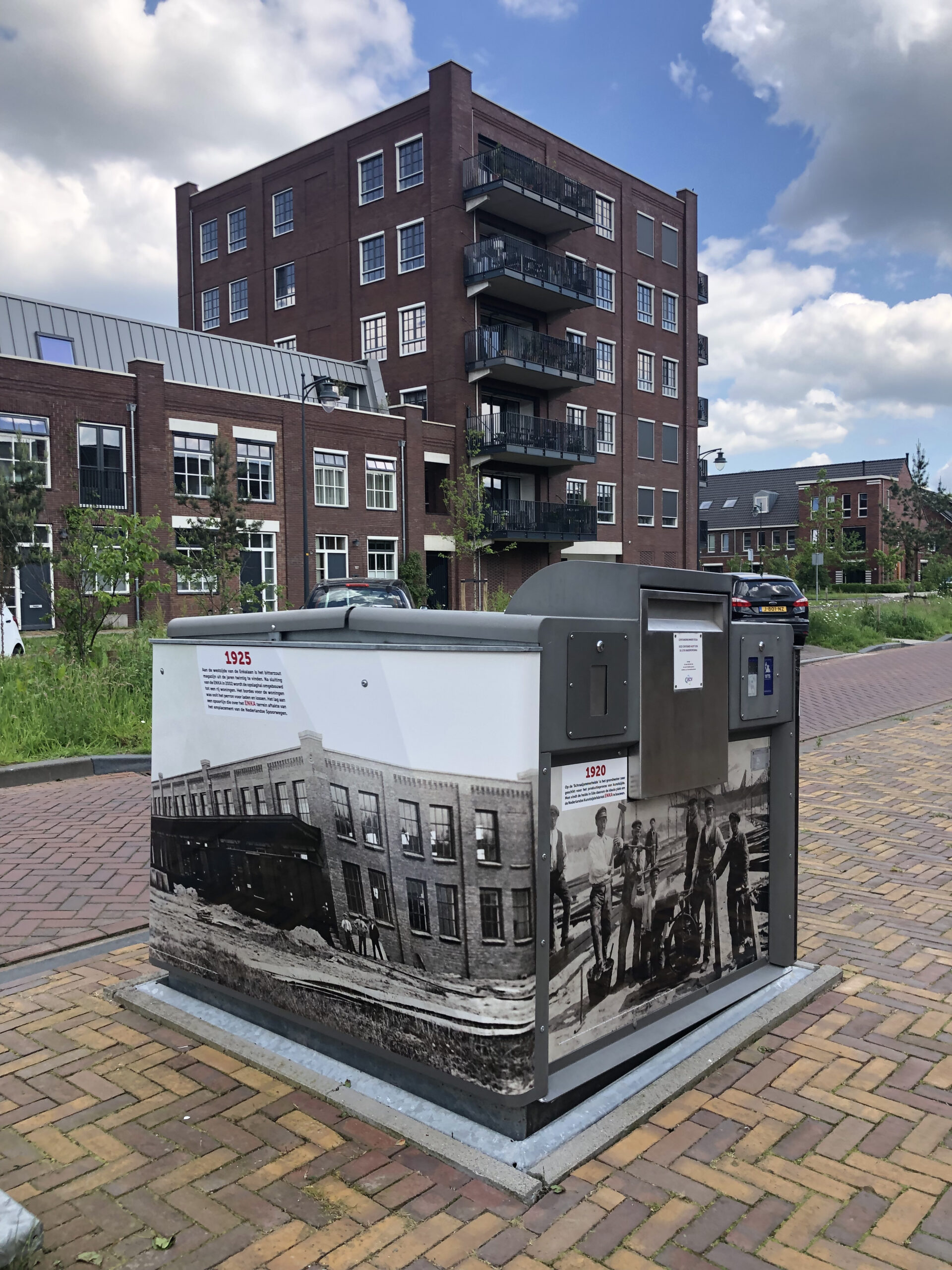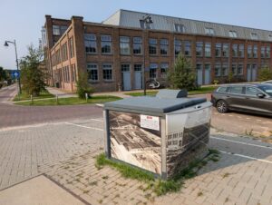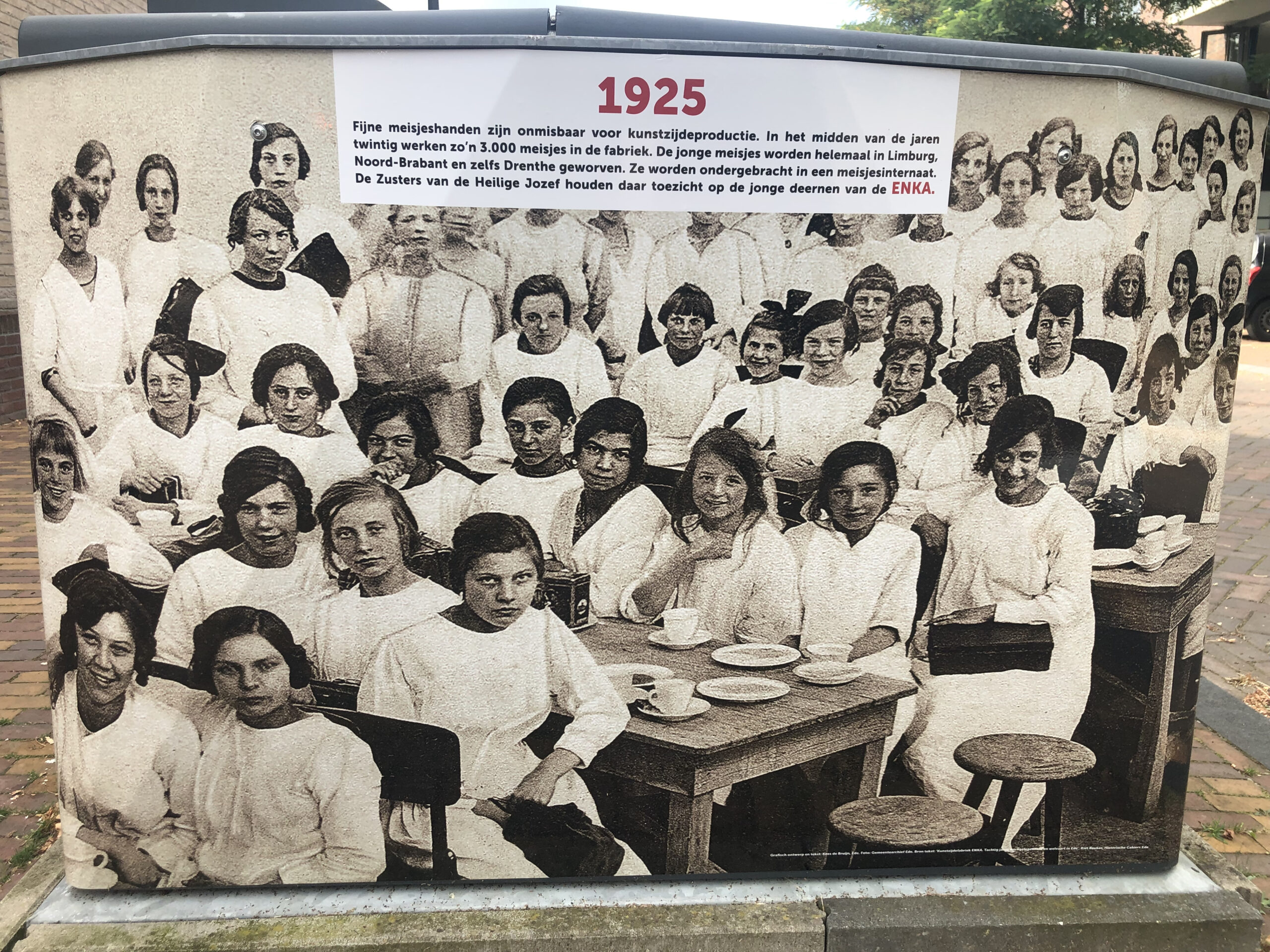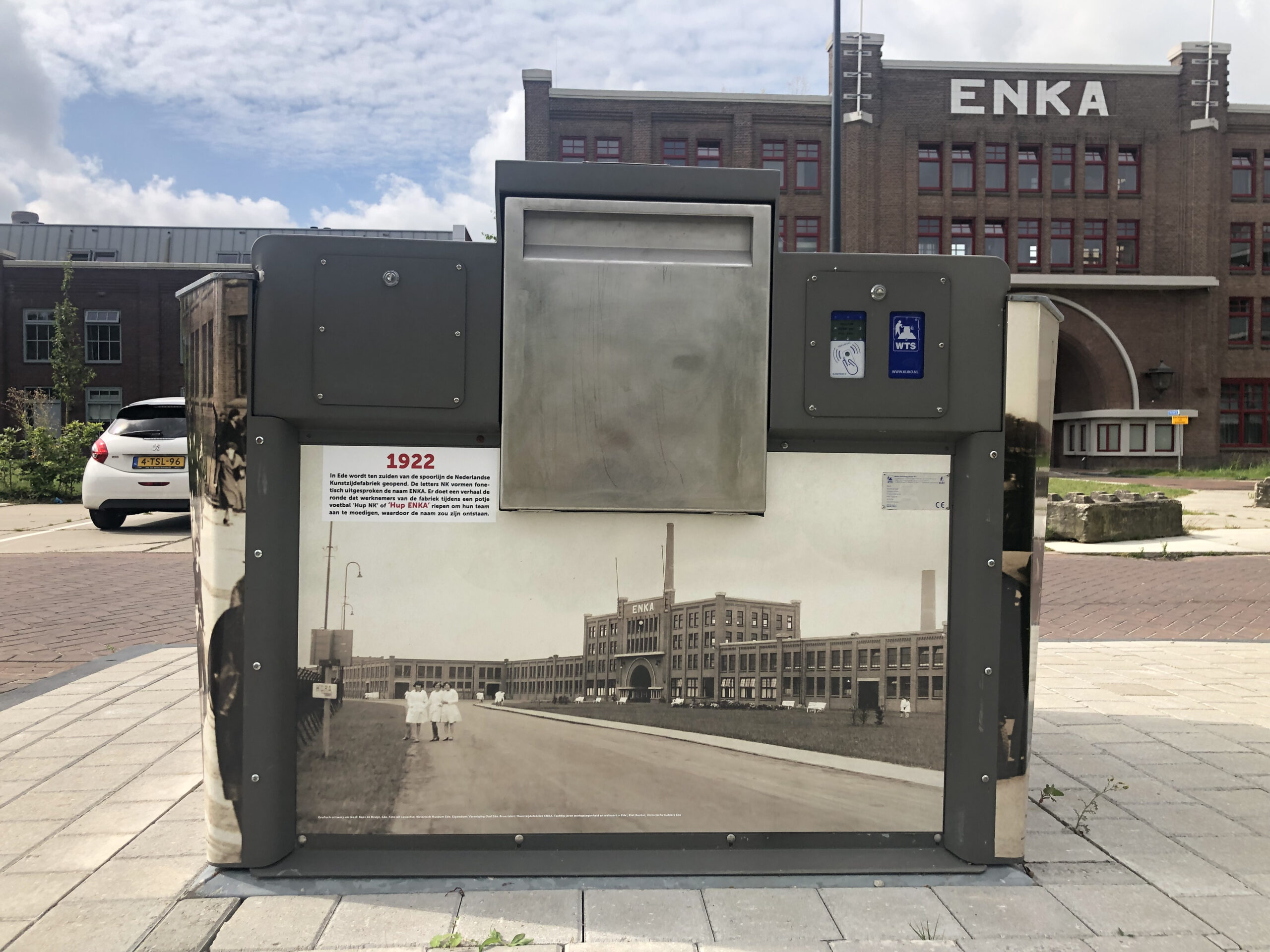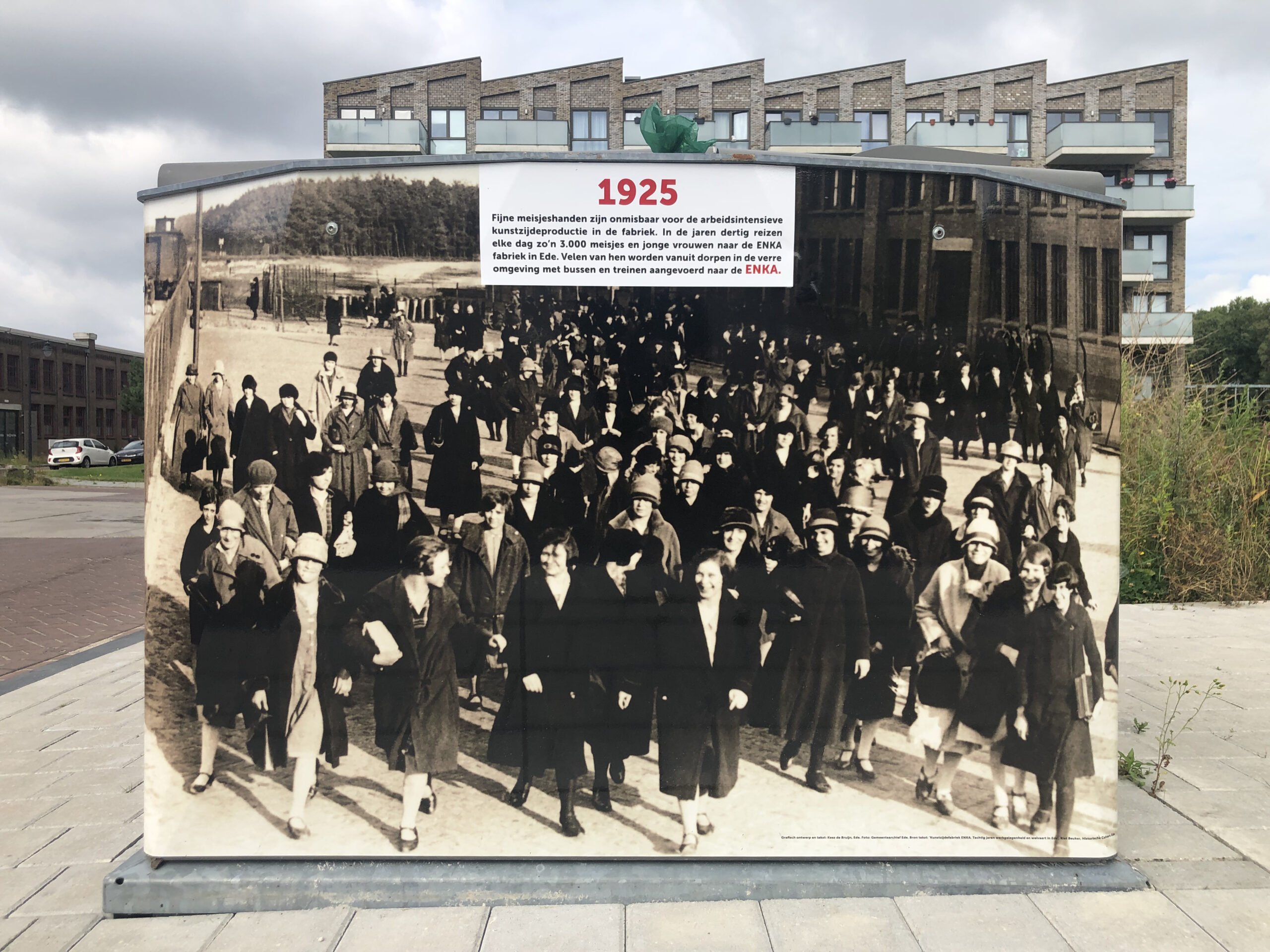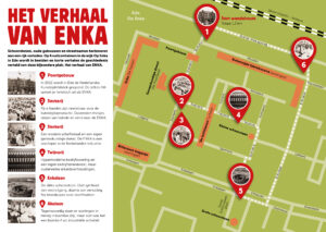 Het bovengrondse deel van een aantal ondergrondse afvalcontainers is inmiddels voorzien van graffitiwerende stickers. U vindt ze bij het Poortgebouw, op de Sterkerij (2x), de Twijnerij, de Enkalaan en de Akulaan, met foto’s, voorzien van datum en een verhaal over wat er op de bewuste plek gebeurde en wie er werkten. Wellicht komen er nog meer, maar van het huidige ‘Verhaal van Enka’ is een folder met wandelroute beschikbaar in de wijk bij De Fietser en het voormalige EHBO-gebouw en in Ede-Centrum bij Cultura.